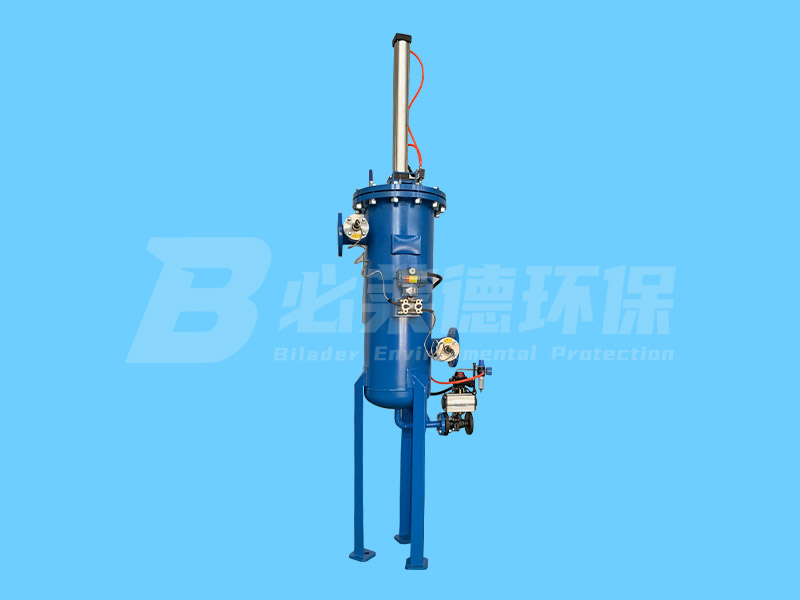 气缸驱动刮刀上下往复运动清洗滤元,刮刀向下运动时,杂质被刮刀推送到过滤器底部,大比重杂质沉淀到集污腔。刮刀向上运动时,残留杂质被刮除推送到滤元上端,杂质被流动液体冲走,透过刮刀,回到滤元内表面,刮刀向下运动时被刮走。每次清洗由数次重复运动组成,滤元表面清洗后即可恢复过滤能力。过滤器清洗时可以正常过滤,出液流量不中断。根据工艺要求也可多个清洗周期后,杂质积聚到一定量,定期打开排污阀,排出含高浓度杂质的废液,如必要,也可回收减少物料浪费。